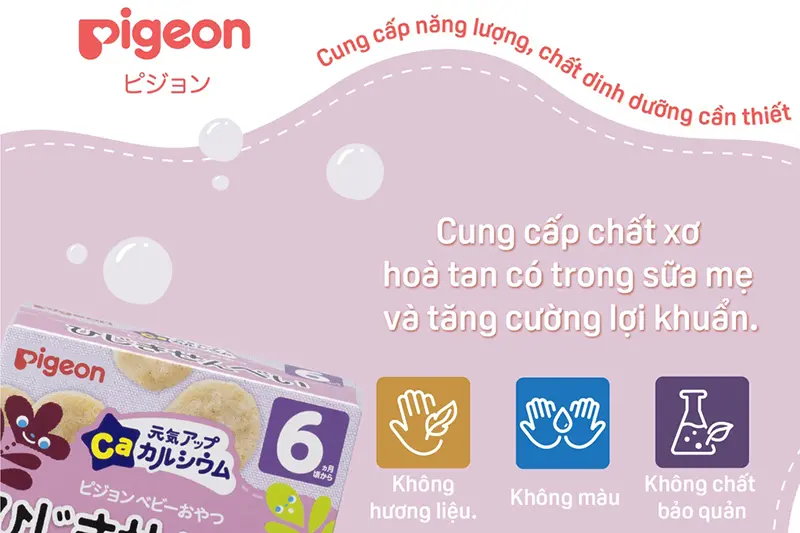 Bánh ăn dặm Pigeon chứa những thành phần dinh dưỡng cần thiết để hỗ trợ sự phát triển não của bé đặc biệt là DHA (Docosahexaenoic Acid), calci, sắt, Iốt, kẽm, các vitamin như A, D, C, acid folic... Các loại vitamin và chất khoáng có trong bánh ăn dặm còn có vai trò rất quan trọng với việc phát triển thể chất của bé.