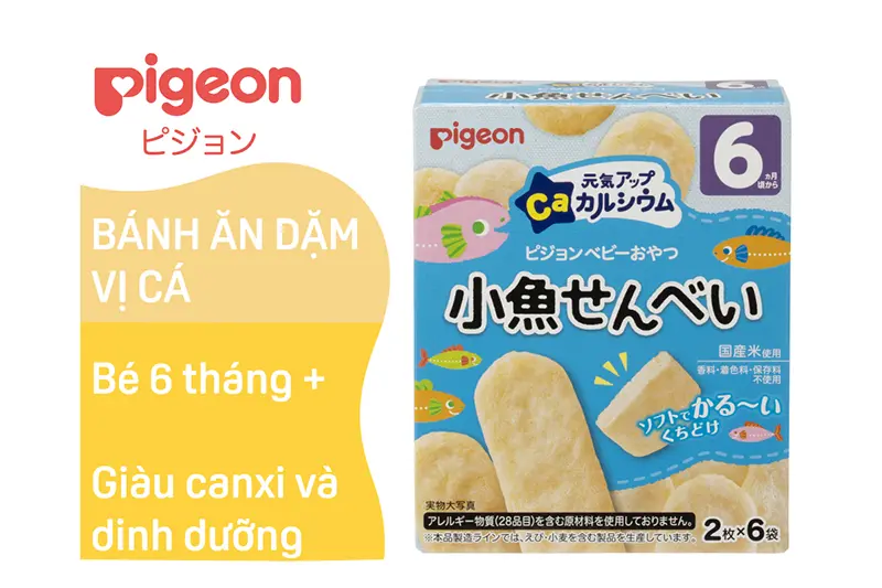 Bánh ăn dặm Pigeon cho bé vị cá đến từ thương hiệu hàng đầu Nhật Bản. Bánh có bổ sung canxi, cùng với hương vị hấp dẫn, giúp tăng cường sức khỏe, kích thích vị giác của bé; tăng cảm giác thèm ăn ở bé yêu, giúp bé nhanh chóng làm quen với các loại thức ăn.