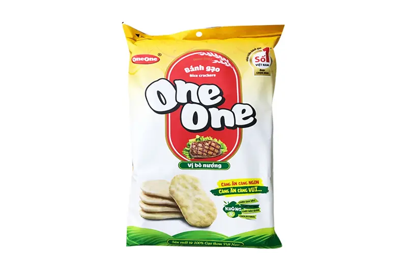 Bánh gạo One One vị bò nướng gói 150g không chiên qua dầu, không chứa cholesterol, không chất bảo quản và không phẩm màu độc hại. Sản phẩm được sản xuất và kiểm soát chất lượng tại Việt Nam.