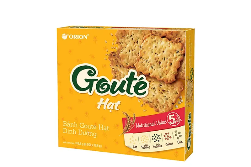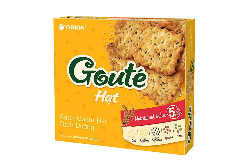 Xuất xứ: Việt Nam Sản xuất tại: Công ty TNHH Thực phẩm Orion Vina Trọng lượng: 316.8gr (8 túi x 39.6gr) Hạn sử dụng: 1 năm Bảo quản: Nơi khô ráo, thoáng mát, tránh ánh nắng mặt trời và nhiệt độ cao. Thành phần nguyên liệu chính: Bột mì, bơ, sữa tươi, các hạt dinh dưỡng (diên mạch, yến mạch, chia đen, mè trắng, mè đen). Hướng dẫn sử dụng: Dùng ngay sau khi mở gói.