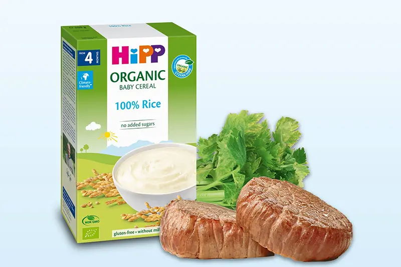 – Thịt hoặc cá xay/băm nhuyễn, hòa tan với 200-250ml nước sạch (có thể dùng nước luộc rau, nước ninh thịt cá..), đun sôi cho thịt (cá) chín, sau đó cho tiếp rau củ đã xay hoặc băm nhuyễn vào đun sôi lại đến khi chín rau củ thì tắt bếp. Đổ hỗn hợp nước rau củ, thịt (cá) ra bát để nguội xuống 50 độ C, cho tiếp 20g bột gạo nhũ nhi vào quấy đều cho đến khi sánh mịn. Nêm thêm 01 thìa/ muỗng dầu ăn đặc chế cho trẻ (dầu Olive, dầu cá hồi…) trộn đều. Kiểm tra độ nóng của bột trước khi cho bé ăn. Lưu ý không cần nấu lại vì bột gạo nhũ nhi của HiPP đã được làm chín và bổ sung thêm vitamin B1.