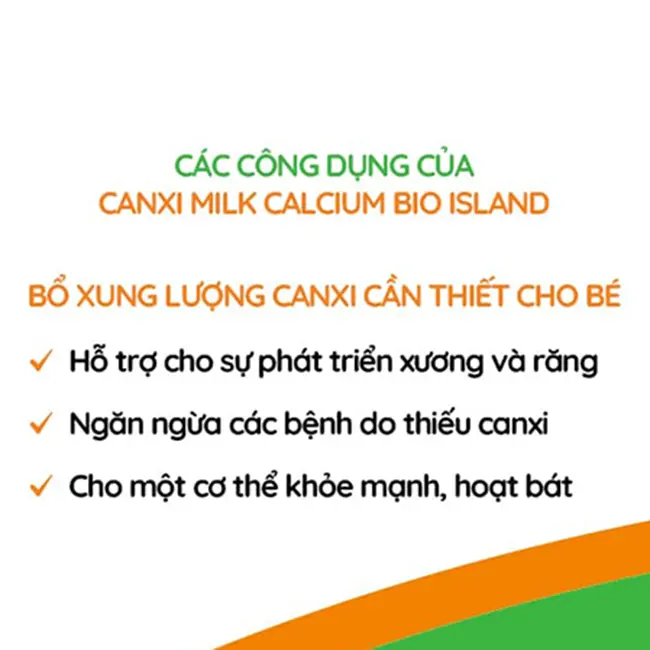 Sản phẩm hỗ trợ bổ sung hàm lượng canxi tối ưu đáp ứng nhu cầu của trẻ, bù đắp lượng canxi thiếu hụt do chế độ ăn hoặc do các vấn đề về sức khỏe mà bé đang gặp phải, hỗ trợ sự phát triển của xương và răng trong những năm tháng đầu đời, tạo nền tảng tối ưu cho sự phát triển sau này.