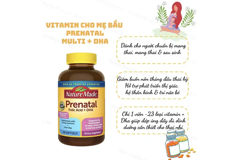 Thuốc cho bà bầu bổ sung các vitamin, khoáng chất và DHA cho phụ nữ chuẩn bị có thai, có thai và cho con bú. Giảm khả năng bị mắc các chứng bệnh về trí não.Thành phần