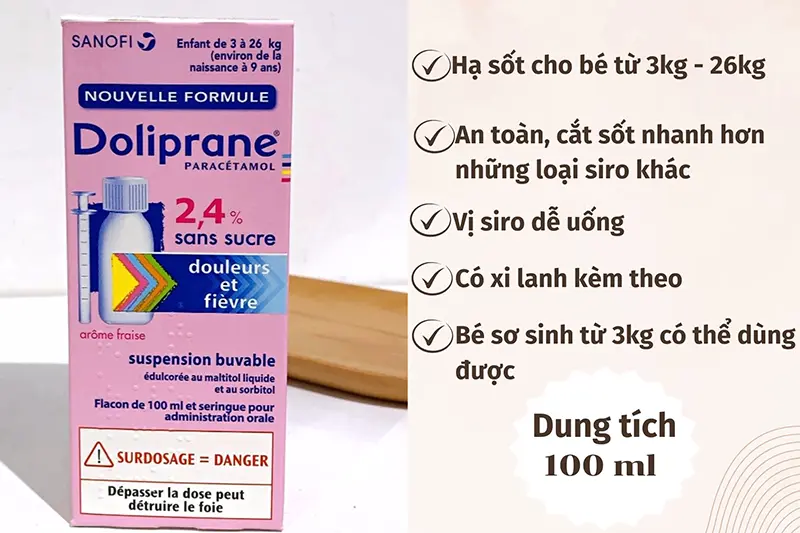 Siro hạ sốt Doliprane 2.4% lọ 100ml là sản phẩm được nhiều bác sĩ khuyên dùng cũng như kê đơn bởi mang lại hiệu quả nhanh chóng, an toàn và tiện lợi.