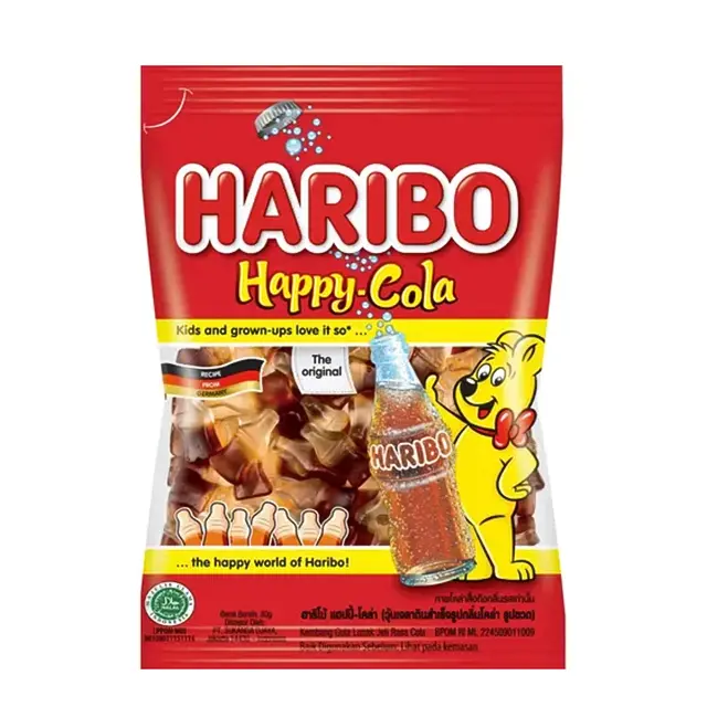 Thành phần: Si-rô Glu-cô và dextrose (51,3%), Đường (24,5%), gelain Halal (bò) (6,1%), chất điều chỉnh độ acid E330, si-rô caramel, hương liệu tự nhiên (cola), dầu cọ, chất tạo bóng (E903, E901).