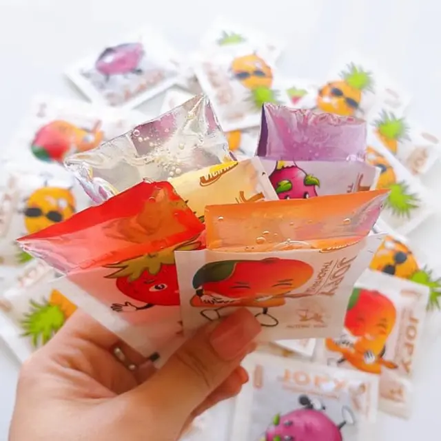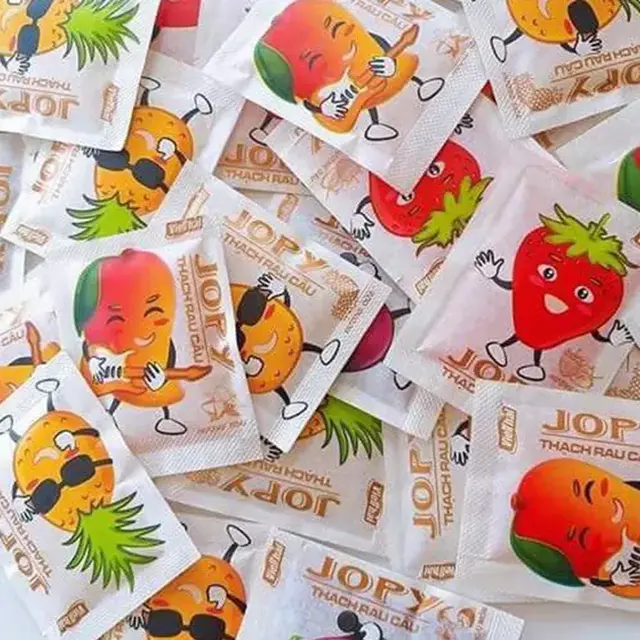 Thạch rau câu có dạng các miếng nhỏ đựng trong các túi giấy in hình trái cây ngộ nghĩnh.