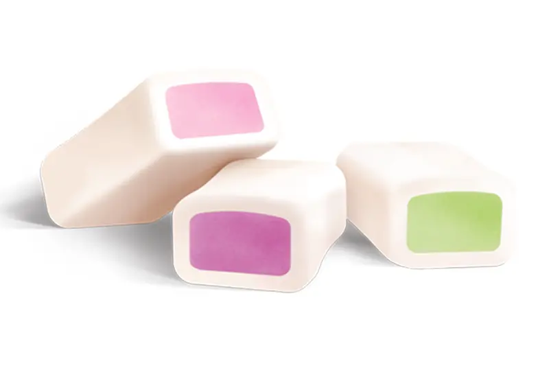 + Dâu: Syrup (31,2%), đường (29,8%), dầu thực vật, gelatin, thịt quả dâu (9,7%), chiết xuất dâu cô đặc (5%), chất điều chỉnh độ acid E270, chất nhũ hóa lecithin, hương thực phẩm tự nhiên và tổng hợp, tinh bột bắp, màu đỏ của củ cải.