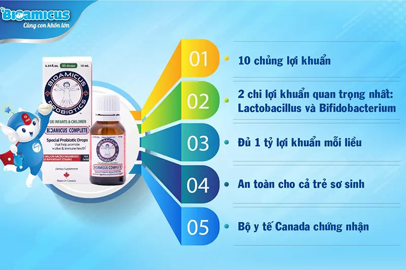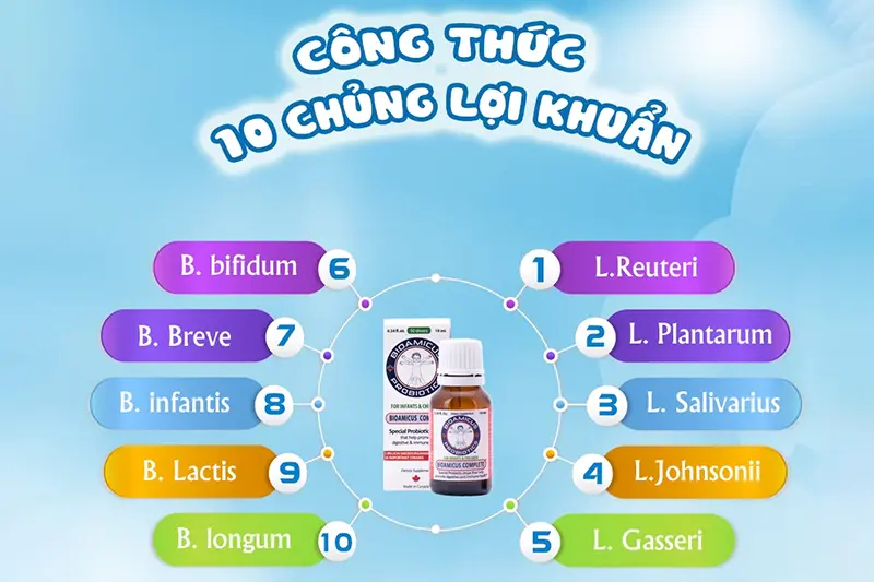 Đặc biệt, 10 chủng lợi khuẩn của BioAmicus Complete kích thích hệ miễn dịch, tăng sức đề kháng. Do đó ức chế mầm bệnh, chống lại vi khuẩn có hại cao giúp bé khỏe mạnh, tránh ốm vặt.