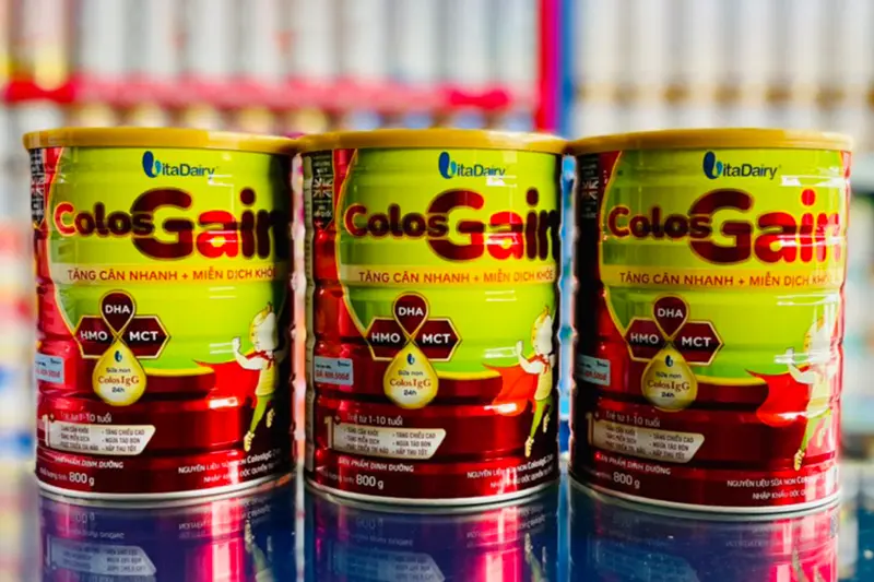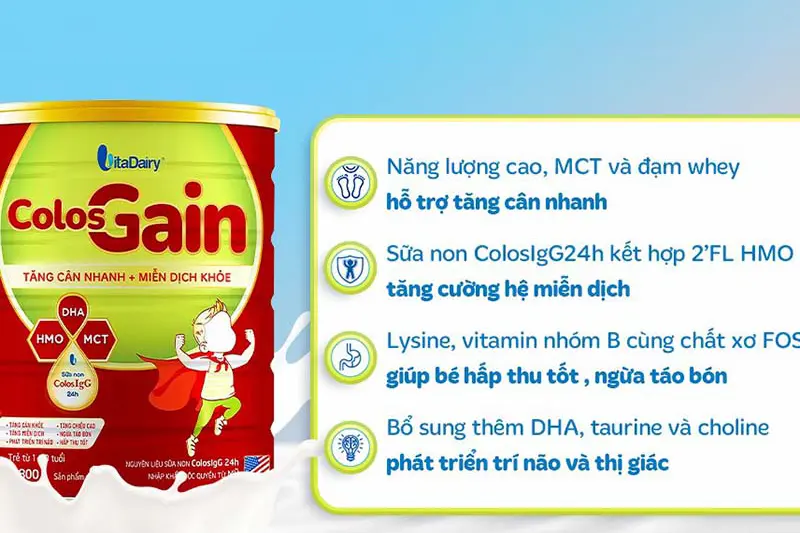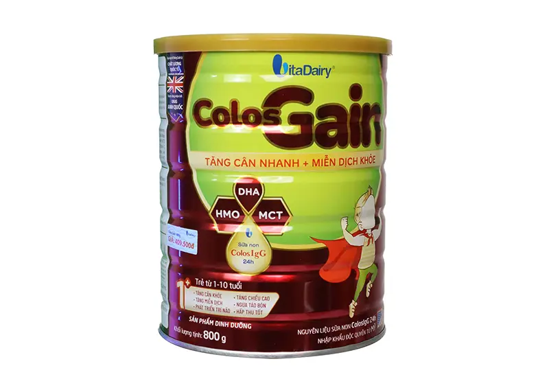 Ưu điểm nổi bật + Colos Gain có sự kết hợp giữa công thức dinh dưỡng đột phá cao năng lượng (đậm độ dinh dưỡng chuẩn 1.0 kcal/ml), với các dưỡng chất dễ hấp thu MCT, Whey protein và Lysine giúp cải thiện biếng ăn để đạt tổng thể giúp trẻ tăng cân tốt; + Colos Gain được bổ sung sữa non ColosIgG24h - sữa non thu trong 24h đầu tiên, được VitaDairy nhập khẩu độc quyền từ Mỹ giúp cung cấp kháng thể IgG để tăng cường miễn dịch. Đây là kháng thể mạnh nhất trong cơ thể có khả năng gắn kết và tiêu diệt yếu tố gây bệnh giúp trẻ hạn chế ốm vặt, phòng ngừa nhiễm khuẩn hô hấp, tiêu hoá; + Lysine, Vitamin B, giúp bé ăn ngon miệng, giảm biếng ăn, FOS/Inulin - chất xơ hòa tan giúp cân bằng tiêu hóa và ngừa táo bón; + DHA, Taurine, Choline giúp bổ sung dưỡng chất cho hoạt động và sự phát triển của trí não và thị giác; + Canxi, Photpho, Vitamin D3 giúp xương chắc khỏe và phát triển chiều cao.