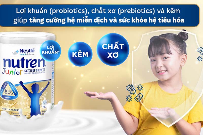 Khi lựa chọn các sản phẩm sữa cao năng lượng hỗ trợ tăng cân cho trẻ suy dinh dưỡng mẹ thường lo lắng bé dễ bị táo bón, với sữa Nutren Junior mẹ hoàn toàn yên tâm bởi sản phẩm được bổ sung công thức Synbiotics với 2 nhóm lợi khuẩn probiotic giúp tăng cường sự phát triển lợi khuẩn, giúp hệ tiêu hóa hoạt động hiệu quả kết hợp cùng Prebiotics là thức ăn của lợi khuẩn. Sự kết hợp này giúp hỗ trợ đường ruột khỏe mạnh phòng ngừa táo bón, giúp tăng cường hệ miễn dịch của trẻ - 80% tế bào miễn dịch nằm ở đường tiêu hoá, tiêu hoá khoẻ sẽ giúp cải thiện đề kháng, trẻ ít bệnh, nhanh hồi phục khi bị bệnh.