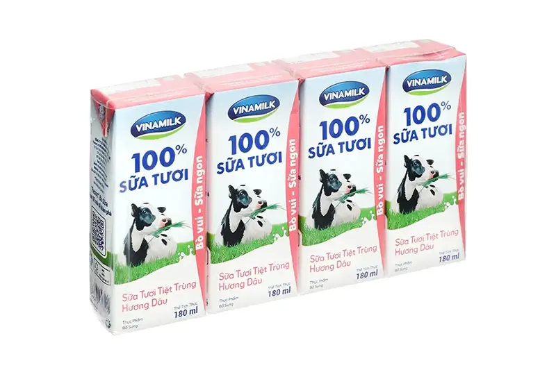 + Sữa tươi tiệt trùng Vinamilk 100% hương dâu được làm hoàn toàn từ sữa bò tươi, mang đến vị sữa béo thơm, hương dâu ngọt ngào, dễ uống.