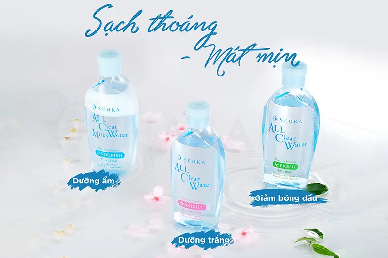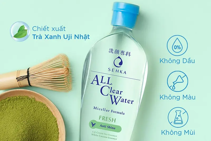 - Nước Tẩy Trang Senka All Clear Water Fresh Anti Shine (70ml; 230ml; 2x230ml): làm sạch sâu da, hỗ trợ giảm mụn, kiểm soát nhờn.
