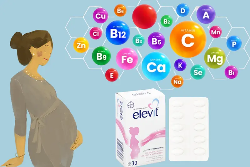 – Vitamin tổng hợp Elevit cho bà bầu cung cấp đầy đủ vitamin và khoáng chất như sắt, acid folic, Canxi …