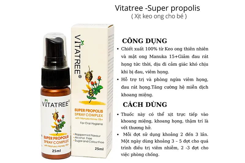 - Uống: Xịt trực tiếp 2-5 cái vào miệng và cổ họng giúp hỗ trợ trị các chứng viêm họng, loét họng, các vấn đề về hô hấp, tăng cường sức đề kháng và miễn dịch, hỗ trợ điều trị bênh tật bởi keo ong là kháng sinh tự nhiên và duy trì sức khỏe.